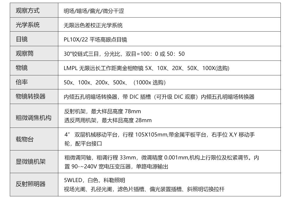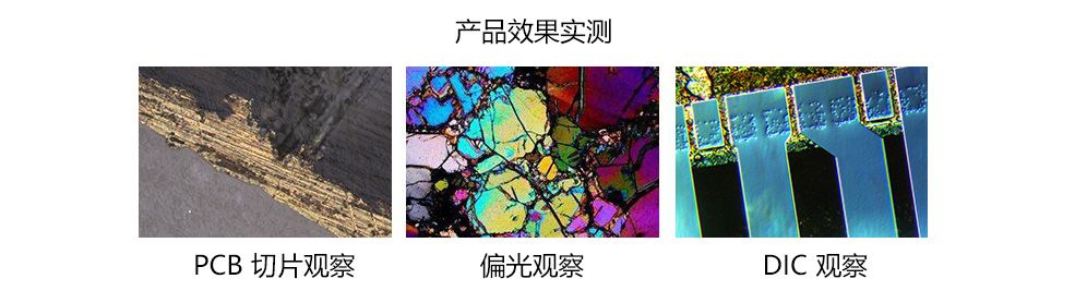 ② 铰链式双目/三目/数码一体化观察筒,视度可调节,30°倾斜。 无限远平场消色差超长工作距专业金相物镜,无 盖玻片设计。